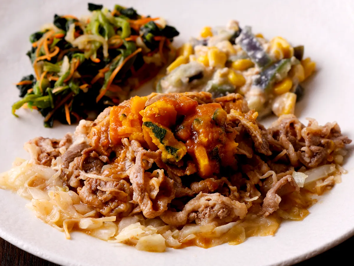 牛肉を特製だれで味付けし、キャベツ・えのき・カボチャを添えて、ナッシュ基準の糖質・塩分そのままでボリュームアップ!お肉た〜っぷりで食べ応え充分。