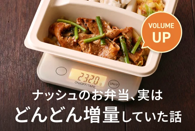 実は、ナッシュのお弁当の重量は、ここ数年で段階的に、そして確実に増えていることをご存知でしょうか?これまでの重量の変化(全体的な基準の推移)を振り返ってみます。