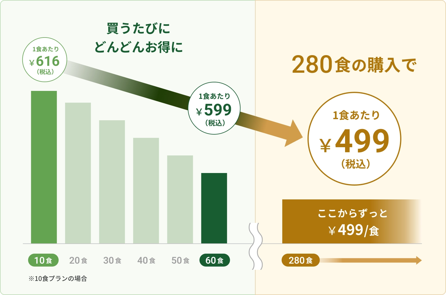 注文数が多いほど1食あたりの価格が安くなる仕組みです。